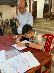 Sau lời phát biểu và căn dặn của cha giám Đốc, cha đặc trách khuyến học nói lên lòng biết ơn đối với hội bác ái Phanxico và Qúy Ân Nhân đã yêu thương quan tâm đặc biệt đến những em được nhận học bổng này. Và mời gọi các em học sinh đền đáp lòng biết ơn bằng cách cố gắng học giỏi, trở thành những con ngoan.