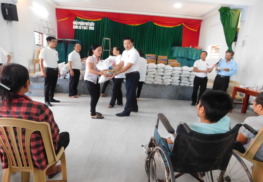 2. Bên cạnh những xuất học bổng, Qúy Ân Nhân cũng trao một ngàn xuất quà cho những gia đình khó khăn, ốm đau, bệnh tật và một số xe lăn cho những người đi lại khó khăn. Đây là sự động viên không chỉ về mặt vất chất mà còn bằng cả tinh thần nữa, từ những người ở rất xa chưa một lần gặp mặt thế mà nay lại được gặp nhau, động viên nhau bằng tình yêu thương, sẻ chia trong Chúa Ki-tô. Trước khi nhận được những món quà cha Giám Đốc Caritas cũng cho mọi người biết tấm lòng yêu thương, sẻ chia của quý ân nhân cho Giáo Phận, cha mời gọi mọi người đáp lại tấm lòng của quý ân nhân dành cho mình bằng lời cầu nguyện.